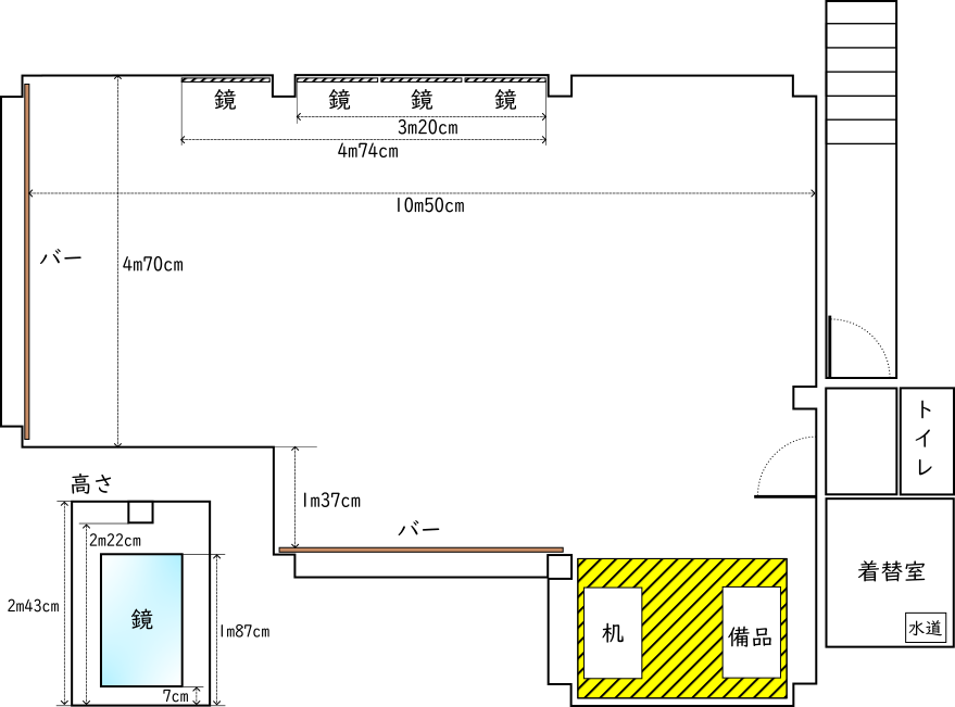 外階段を昇った3階にあります。窓を開けると風通しが良く、約40畳のフロアーがあるレンタルスタジオです。